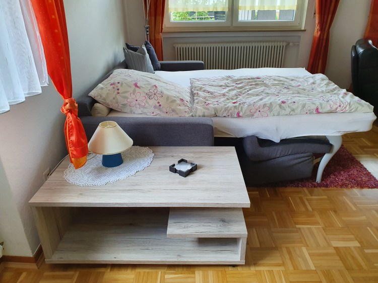 - Wohnzimmer mit Essplatz, Schlafcoach (1,60 x 2,00m), Smart-TV und DVD-Spieler